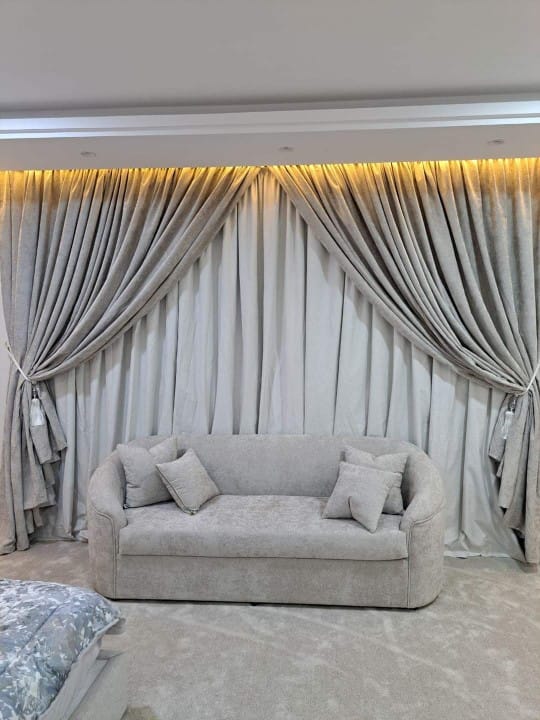 بالتأكيد، نصمم ستائر وكنب مخصص لتناسب جميع المساحات والأذواق